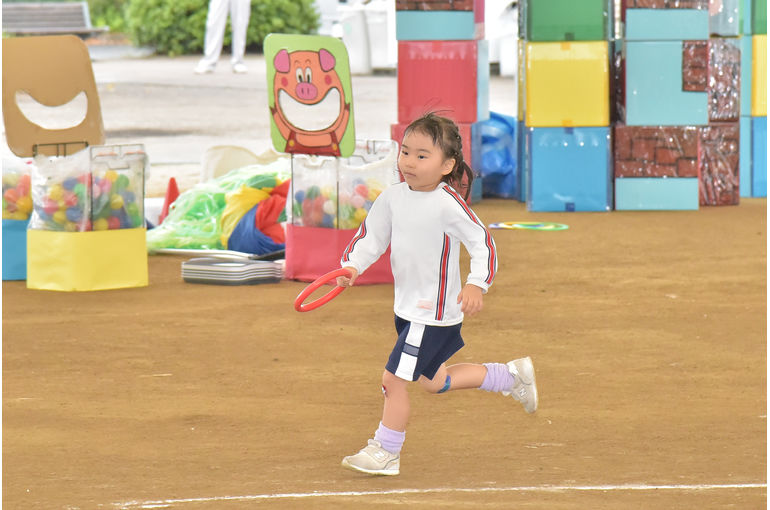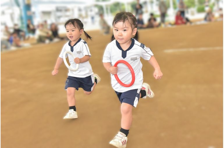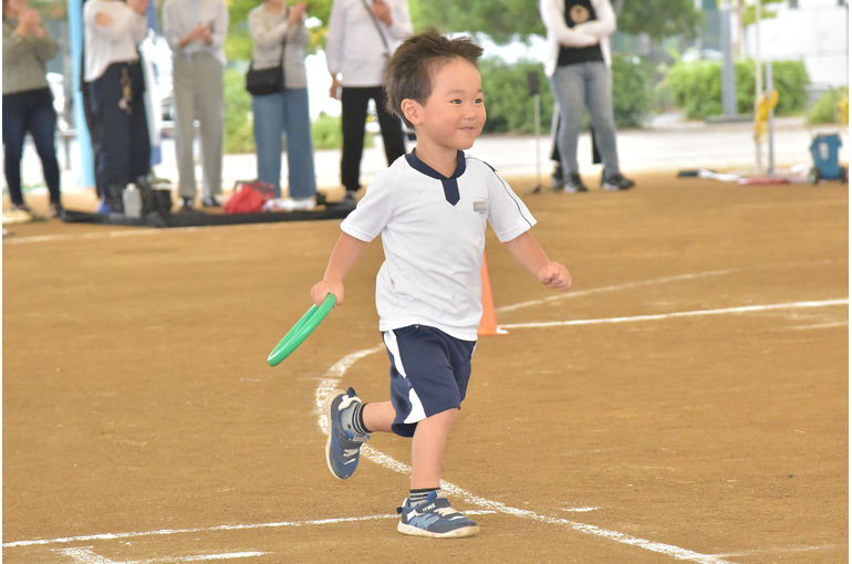 例年は、直線を往復する形でのかけっこをしていたのですが、春から水色名札や紫名札のお友だち(4・5歳児)が、リレーを楽しんでいる姿を見ていたので、自然と3歳児のお友だちも「私達も、トラックを走る!」という気持ちになっていました。